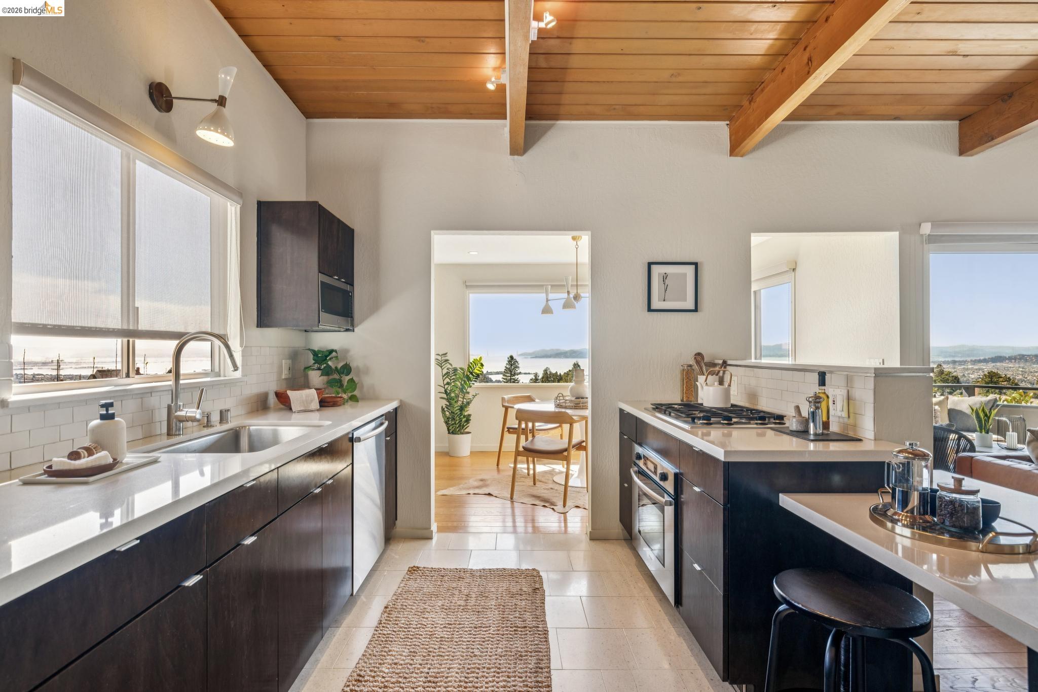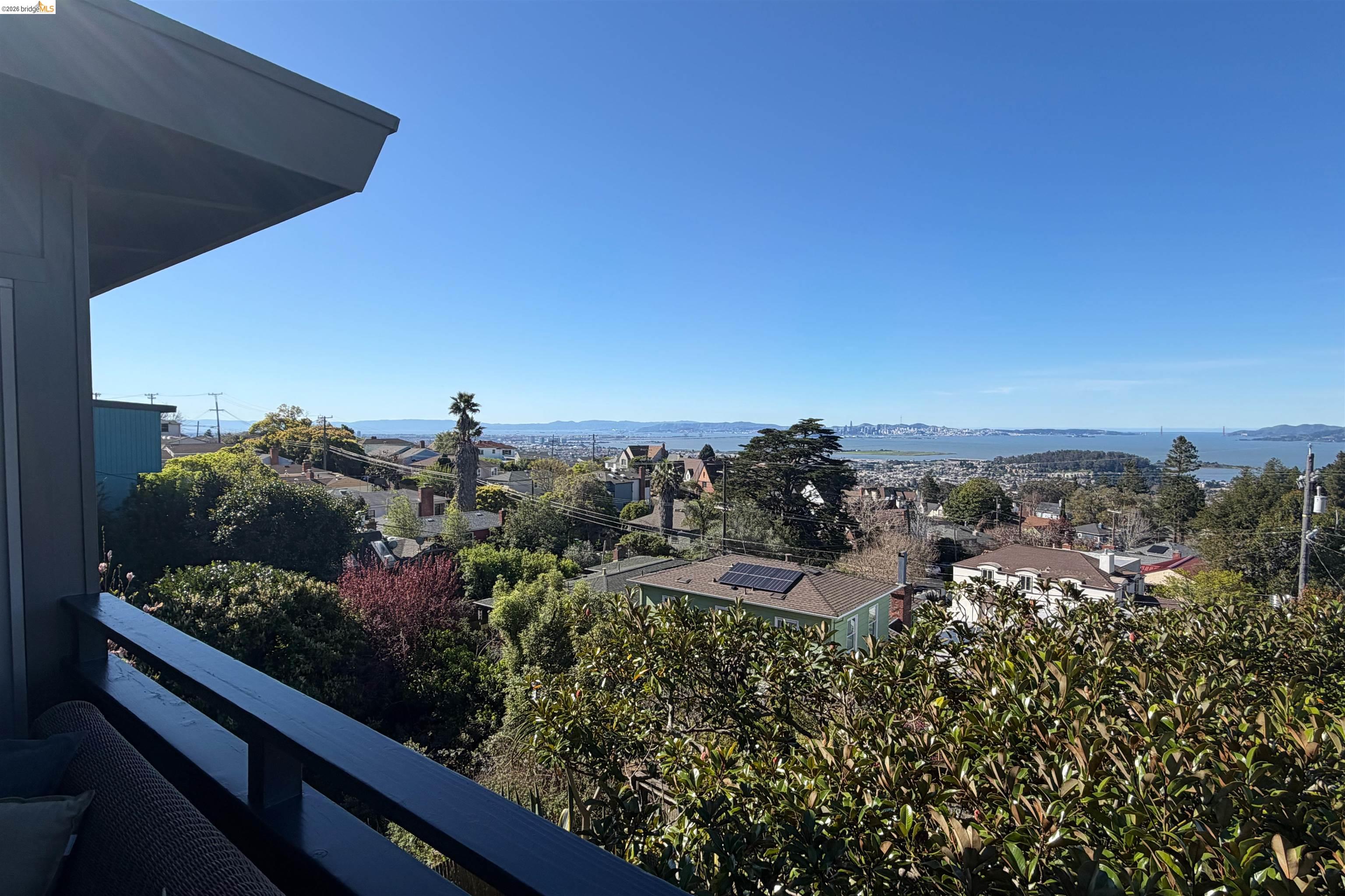 An unassuming treasure 148 Highland Blvd offers sweeping panoramic views that unfold the moment you enter. A 1950s post-and-beam modernist home w/ soaring ceilings, walls of glass, & exposed wood beams, blurring the line between indoors & out. Inspired by Joseph Eichler, it is a celebration of simplicity, natural materials, & a deep connection to nature. Living and dining spaces flow to a sunset-ready view deck, anchored by a wood-burning fireplace w/Heath Ceramics tile. Flexible 3-4 bedrooms and 3 baths include a serene primary retreat and a second principal suite. Original midcentury details are preserved and enhanced w/ terrazzo, Heath tile, rich wood, and original Herman Miller lighting. Modern upgrades include efficient 3 zone heat heating, heated kitchen and lower bath floors, retractable deck shade, partial electrical, thermoset-coated type roof, and a compliant sewer lateral. The elegant garden balances fire resilience w/ design. Steps from Kensington Hilltop Elementary, Kensington Park, Tilden Trails, and near shops and dining, this rare modern retreat perfectly unites architectural authenticity and natural beauty.